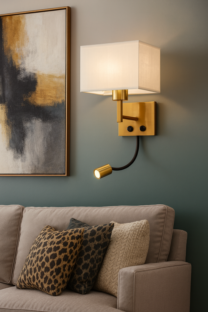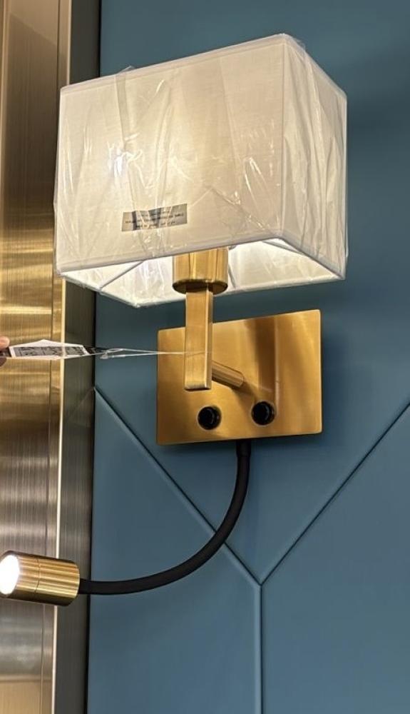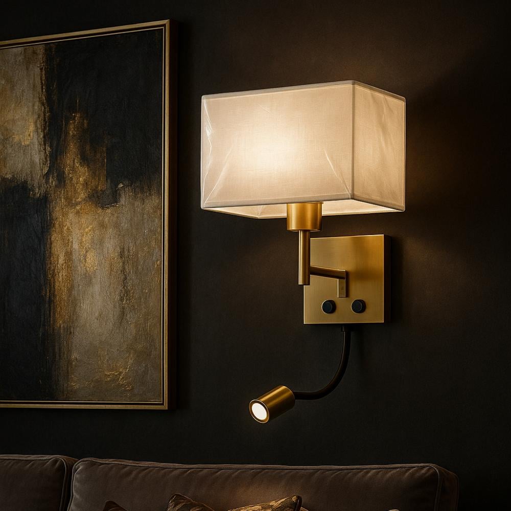يجمع بين إضاءة كلاسيكية ناعمة بغطاء قماشي، وضوء قراءة مرن (LED Spotlight) يمكنك توجيهه حسب الحاجة. مثالي لغرف النوم الفاخرة والفنادق، ويوفر تحكم مستقل لكل مصدر إضاءة بفضل وجود مفتاحين تشغيل.