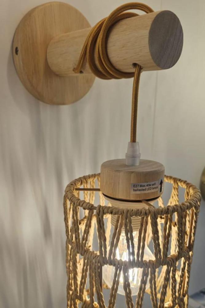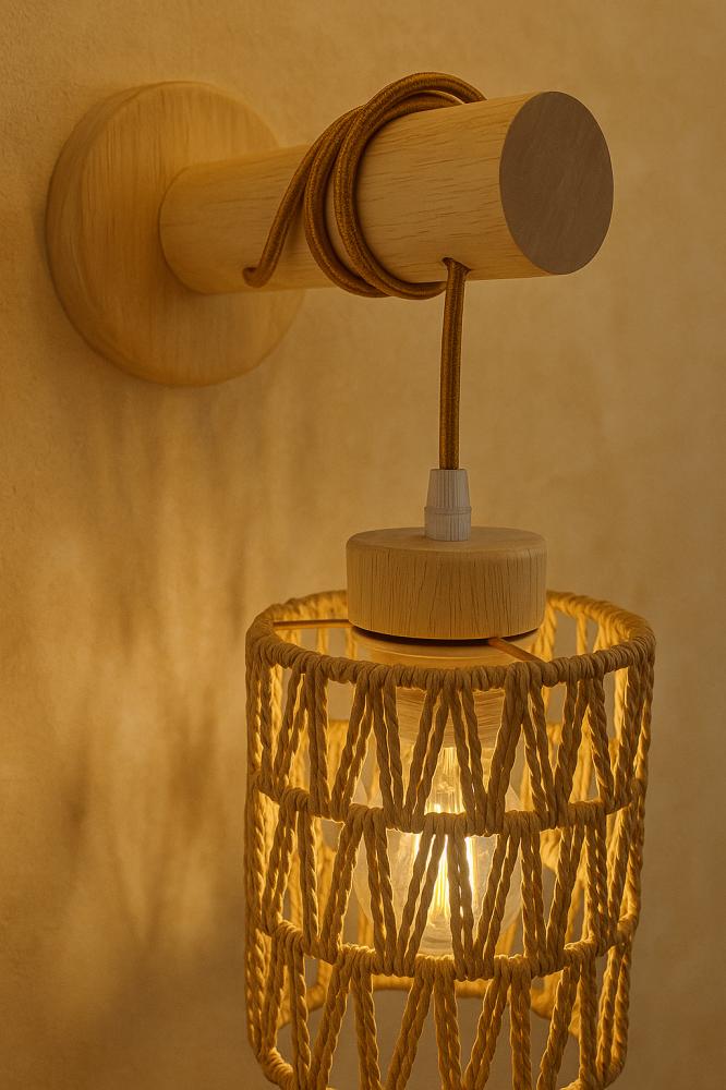 استمتع بجمال الإضاءة اليدوية مع هذا الابليك الجداري المصنوع من الخشب الطبيعي والحبل المضفّر بتصميم هندسي أسطواني أنيق. قطعة فنية تجمع بين البساطة والدفء، وتضيف لمسة استرخاء لأي مساحة داخلية.