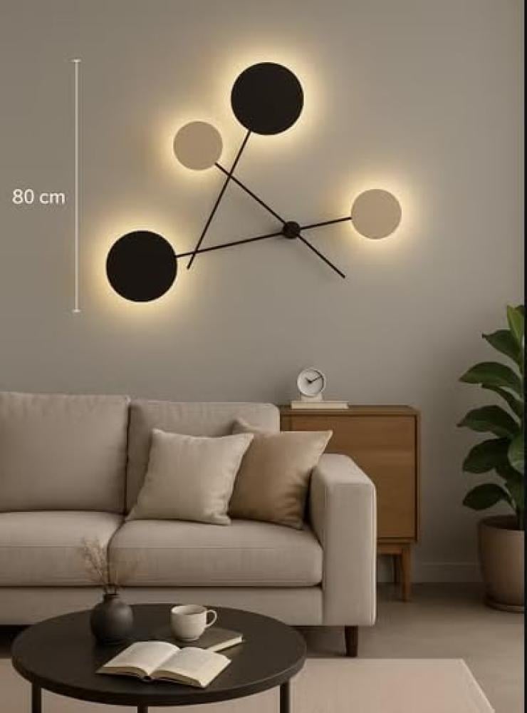 يأتي بتصميم مميز يتكون من دوائر متصلة بأذرع معدنية بلون أسود ورمادي أنيق، مع إضاءة خلفية بثلاث ألوان (أصفر دافئ – شمسي – أبيض بارد) لتتناسب مع مختلف الأوقات والأمزجة.