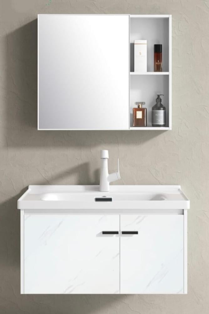 • التصميم: خزانة سفلية بسطح سيراميك، ومرآة علوية أنيقة مزودة بأرفف جانبية لتخزين المستلزمات