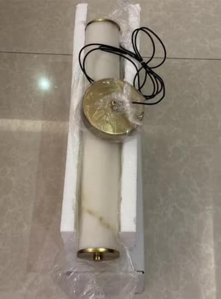 يأتي بتصميم عمودي أنيق يجمع بين الشكل الرخامي الطبيعي واللمسة الذهبية العصرية ليمنحك إضاءة دافئة مثالية لغرف النوم، المجالس أو زوايا الجلوس.
