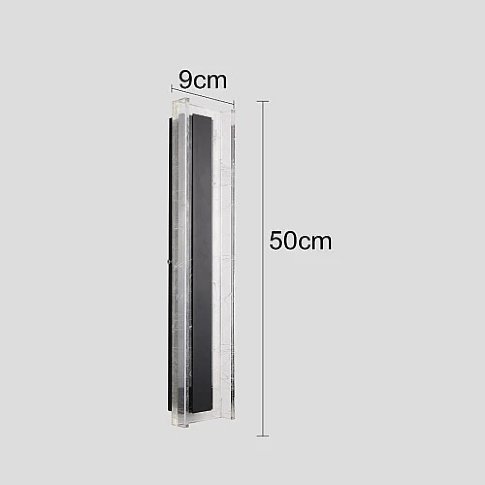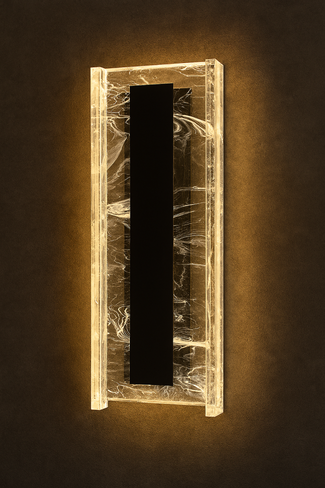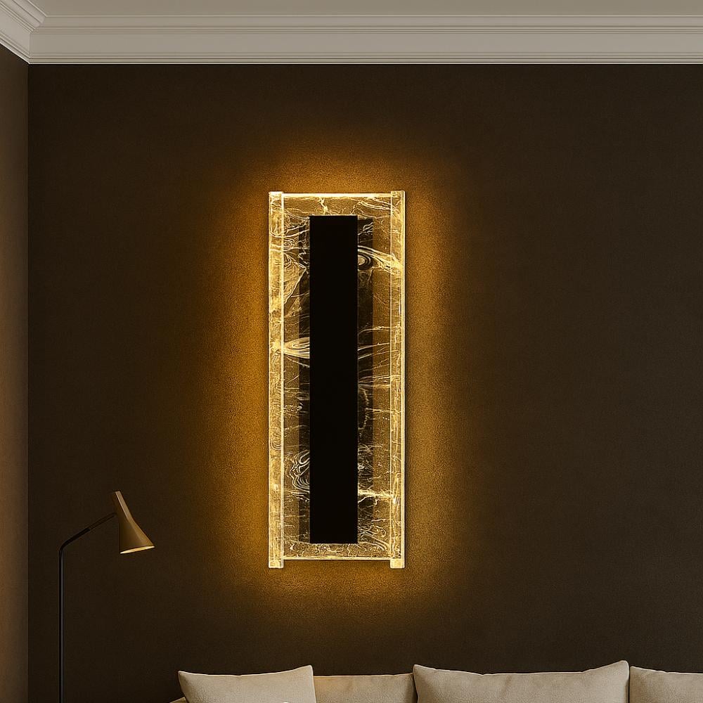 كشاف جداري طولي بتصميم أسود أنيق محاط بإطار رخامي مضيء، يمنح مزيجًا مثاليًا من الفخامة والهدوء. مثالي للممرات، غرف النوم، الأدراج، أو خلف الأرائك واللوحات الجدارية.