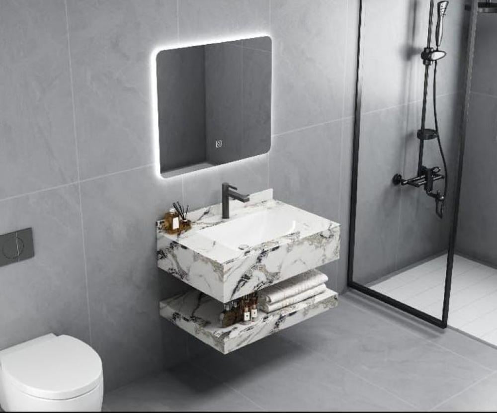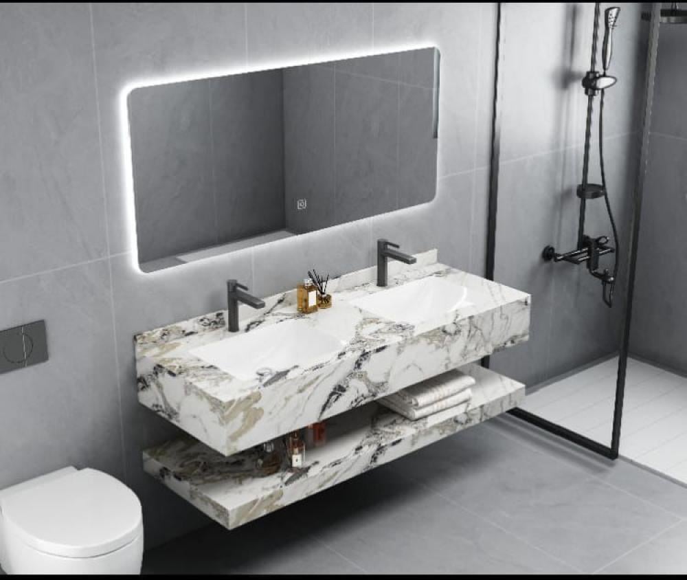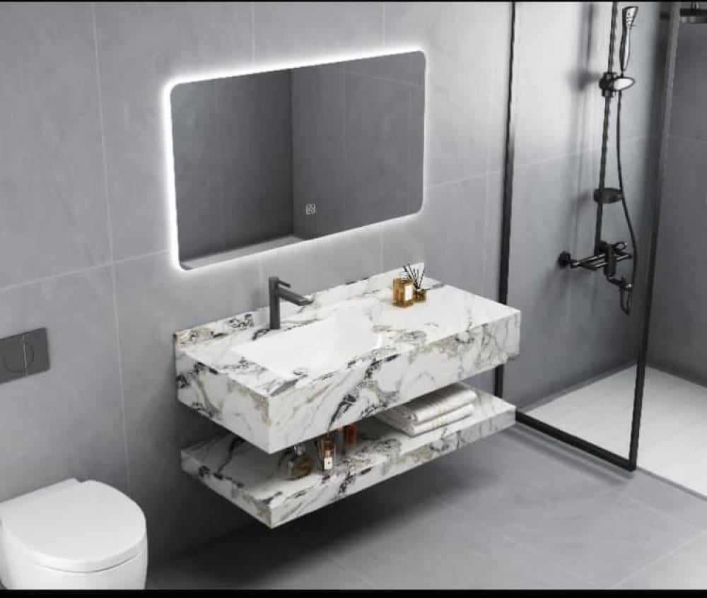 التصميم: قطعتين (مغسلة + رف سفلي) مع مرآة ليد تعمل بزر لمس