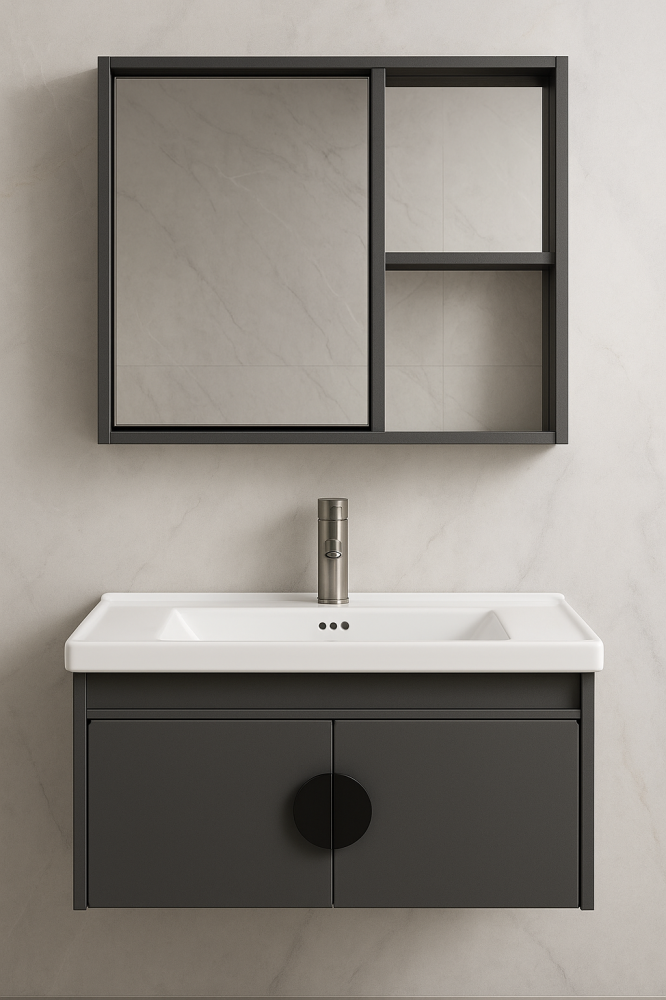 تأتي مع خزانة سفلية عملية لتخزين المستلزمات اليومية، بالإضافة إلى مراية عصرية مع وحدة تخزين جانبية لزيادة التنظيم.