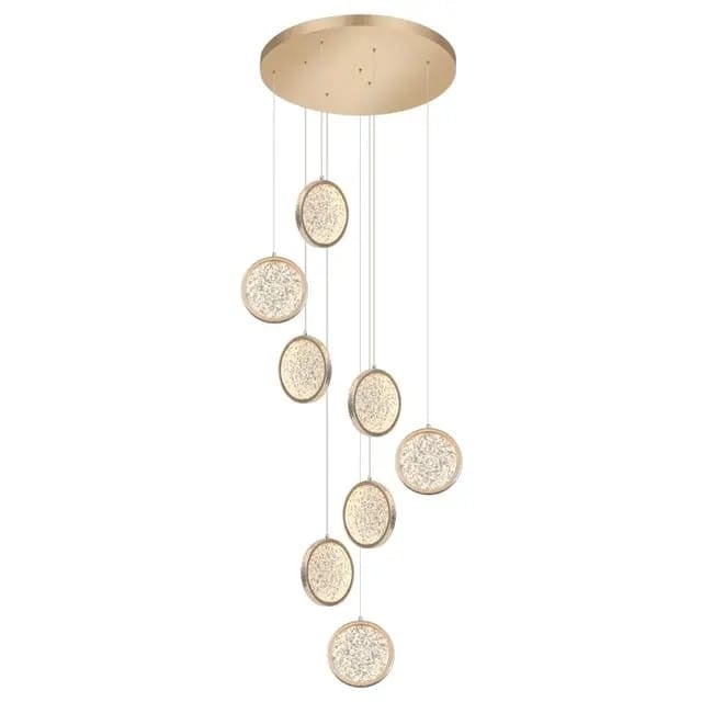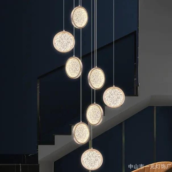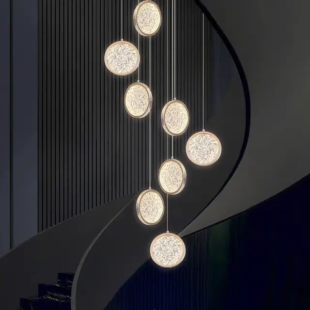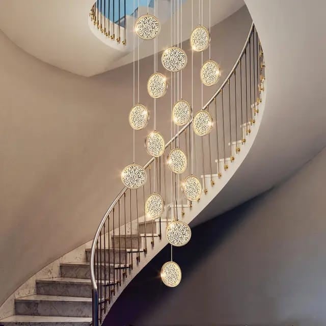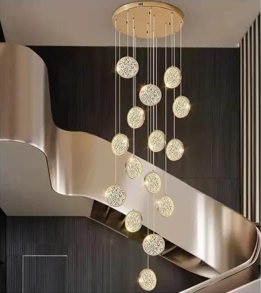 مظهر عام يوحي بالهدوء والجمال، حيث الإضاءة الجذابة والتصميم المذهل الذي يضفي طابعًا من الحُسن والرونق على المكان. هذه الثريا مثالية للفلل، الصالات، والسلالم الدائرية، كما أن لونها الذهبي الفاخر يجعلها سهلة الدمج مع مختلف الديكورات العصرية والكلاسيكية.